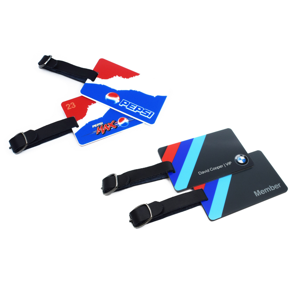 Matt White or Black Acrylic Luggage Tag with Black leatherette buckle strap. Full colour direct digital print to 1 side. Size approx. 85 mm wide x 54 mm high and 3 mm thick. Personalisation and double sided print available for additional costs. MOQ 50. Price is per tag