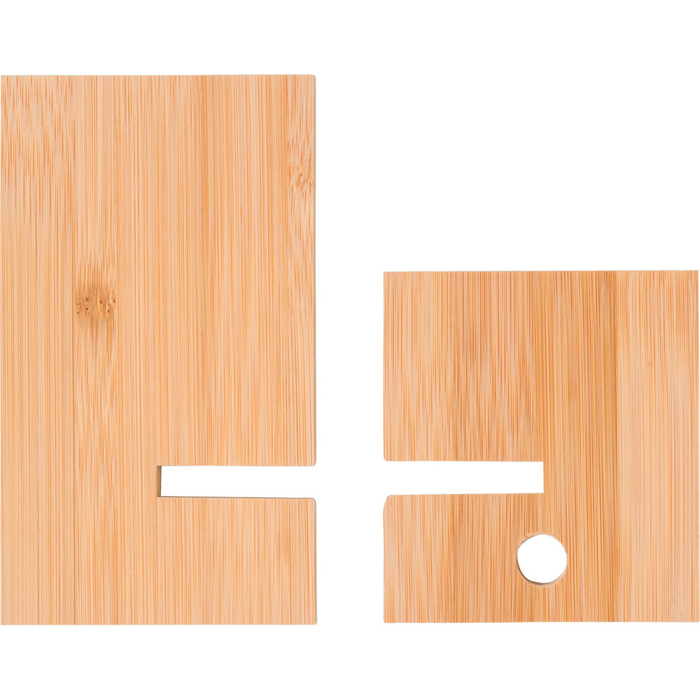 Bamboo phone stand with opening (1 cm diameter) for the phone charger. Assembly required: delivered in two pieces. Packaged in giftbox.