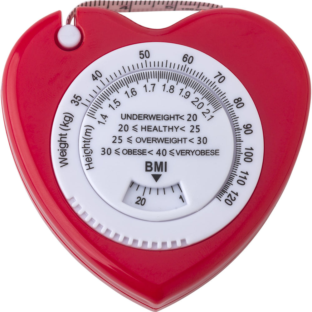 Plastic, 1.5 mt, heart shaped, BMI tape measure, with a white stop button, includes a weight (KG) and height (Mts.) indicator on the front. To be used for promotional purposes.