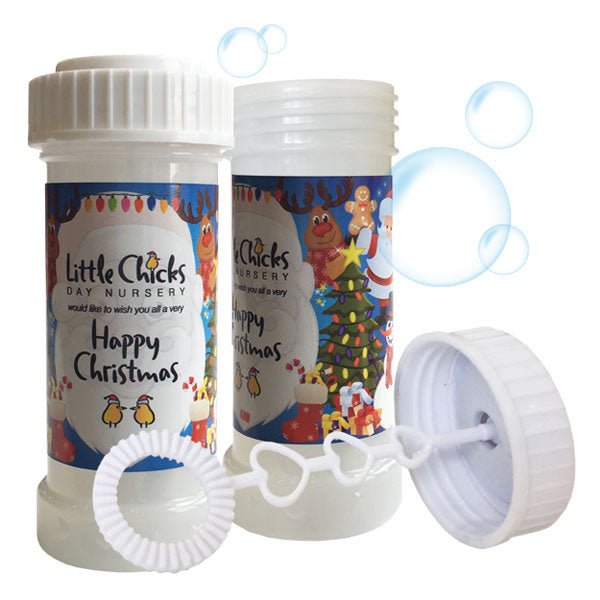 Fun bubbles in a tub. Screw cap with wand attached. Full colour printed wrap around label. Ideal for children's events.