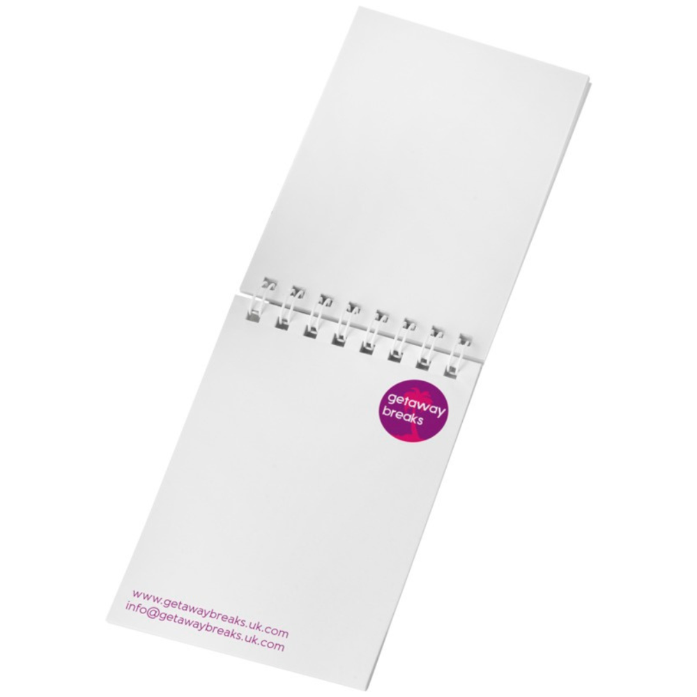 Desk-Mate® spiral A7 notebook. This notebook includes a white or black wire, a glossy card cover (250g/m2), and 50 sheets (80g/m2) blank paper. Decoration possible on the cover and on each sheet.