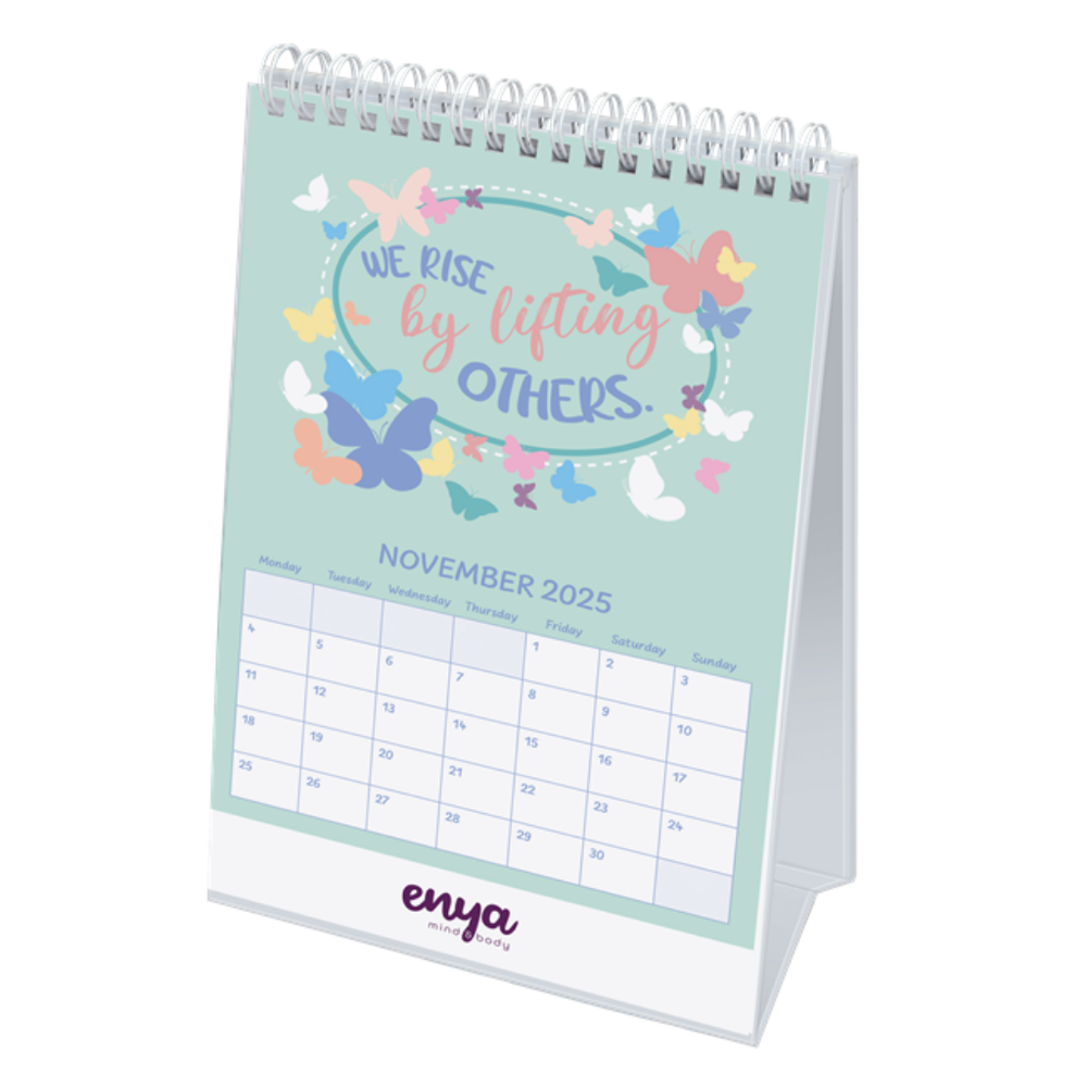 Calendar containing 6 sheets white 300gsm card calendar sheets printed both sides with a 300gsm card cover printed 1 side gloss laminated. With inspirational quotes & a calendar printed 4 colour process both sides. Wiro bound onto a gloss laminated hardback easel. Individually packed in white peel and seal envelopes. Manufactured in the UK in our Carbon Zero factory.