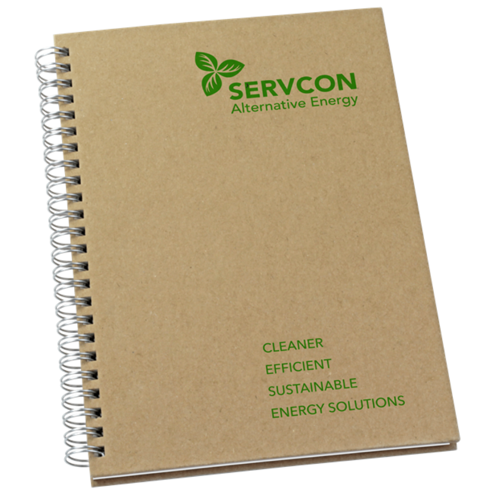 A5 hardbacked notepad with a recycled natural paper-over-board cover contains 50 sheets of off-white recycled paper. Wiro bound along the left hand side with white wire. Manufactured in the UK in our Carbon Zero factory. Bulk packed.
