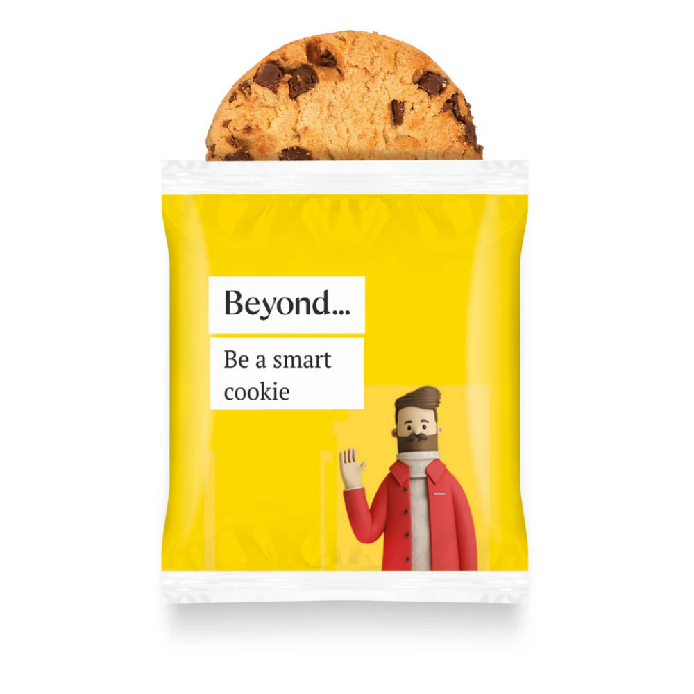 One flow wrapped Maryland chocolate chip cookie. Branded with a full colour digital print to the plastic film packaging. Each Mary Land cookie is sealed inside your own designed outer flow packet wrapper.