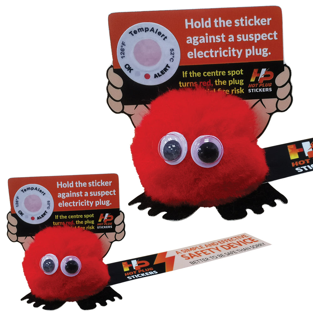 Logobug holding a billboard with a Hot Plug safety sticker on 1 side. The sticker will change to red when a plug reaches 52℃ or above. Ribbon printed with your promotional message in full colour. See pom colour section for the full range of pom colours.