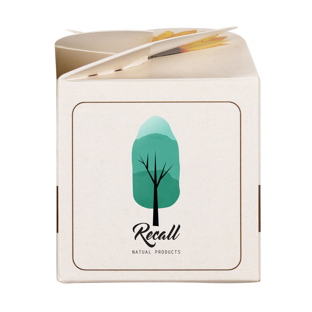 This charming pre-printed carton with a flower-style closure makes a delightful gift. Inside, you'll find a mini terracotta flower pot, a Cocopress® compost tablet, and a packet of seeds of your choice. The carton features one plain side, perfect for a digitally printed label showcasing your logo or message, making it an excellent choice for branding or personalized gifting. Each carton also includes easy-to-follow growing instructions. Select from seven ready-made designs that complement your seed choice: Sunflower, Christmas Tree, Vegetable Patch, Wildflower, Kitchen Herbs, Butterfly & Bee Mixture, or Oriental Salad. This unique package is perfect for promotions, events, or thoughtful giveaways.