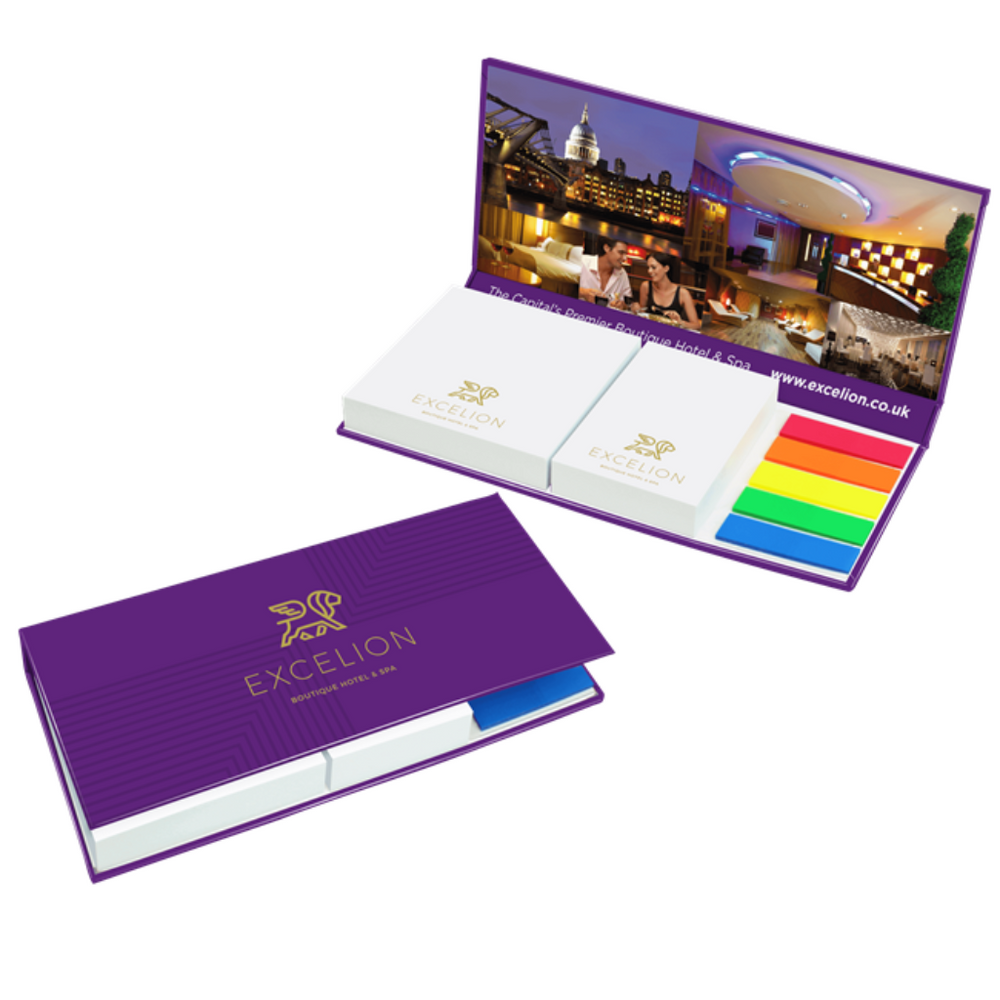 Notespod Slim gloss laminated hard back cover contains five 20 sheet plain index tabs. One A8 (50x75mm) 125 sheet sticky note pad and one 3x3 (75 x 75mm) 125 sheet sticky note pad. Individually shrink wrapped. Manufactured in the UK in our Carbon Zero factory.