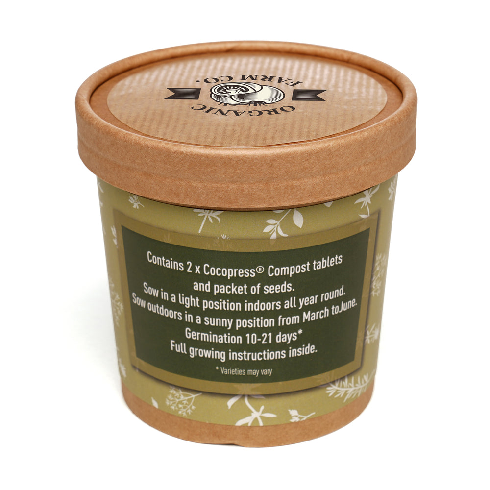 This eye-catching grow kit includes everything you need to start your gardening journey. Inside a 12oz biodegradable paper cup, you'll find two Cocopress® compost tablets, a seed packet with 5 varieties to choose from Kitchen Herbs, Chives, Parsley, Basil, Mint and Fennel along with detailed planting instructions. The cup is topped with a custom-branded paper lid, making it perfect for gifts, promotions, or personal use. Grow green and give back to the planet with this sustainable and easy-to-use planting solution!