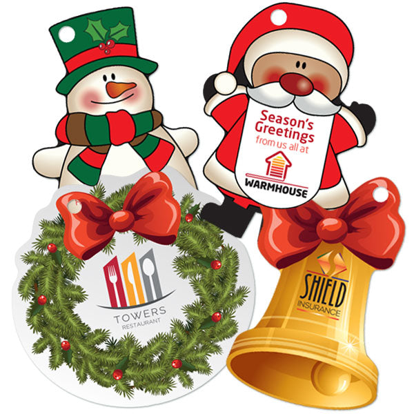 Card tree decorations printed full colour one side. Cut to any shape and supplied with plastic tree hanger.