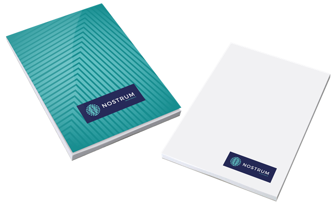 Cover Notepad A6 containing 50 sheets of white paper from a sustainable source with 300gsm card gloss laminated draw-leaf cover. Manufactured in the UK in our Carbon Zero factory. Bulk packed.