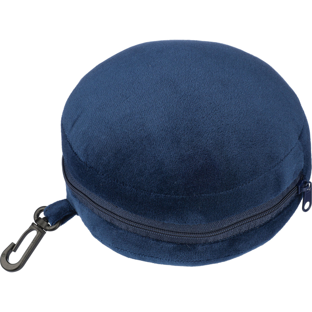 Polyester travel pillow set with a soft polyester and PP cotton filling. Includes an eye mask and pillow when unzipped. Features a carabiner clip for easy attachment during travel.
