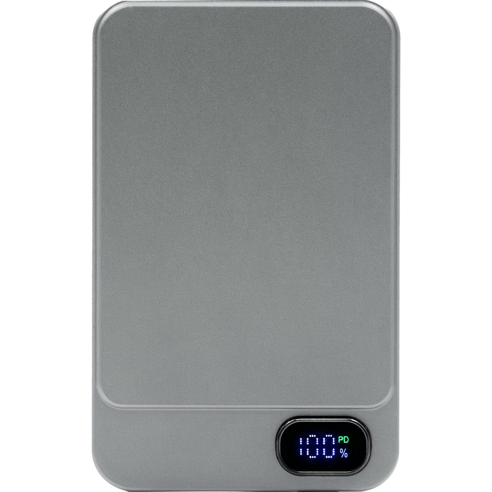 The Powerwave 5000 mAh power bank features a slim aluminium unibody design that fits easily in any pocket. With a 5,000 mAh capacity, it supports 15W magnetic wireless charging (MagSafe, Qi1 & Qi2) for easy, cable-free charging. It also includes a 20W (PD 3.0) USB-C port to charge laptops or other devices as needed. The LCD display shows battery level and charging status, while a smart chip offers protection from overcurrent, overcharging, overheating, and short-circuiting. Designed with a magnetic snap for quick, secure attachment. Magnetic snap design