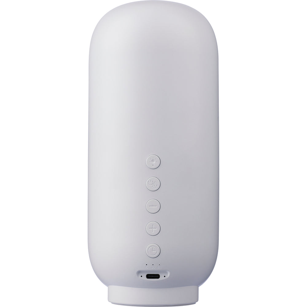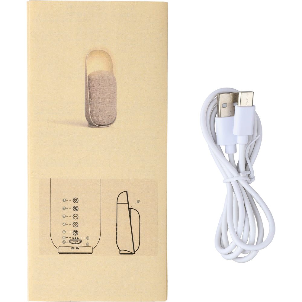 Recycled plastic and rPET fabric, 3-in-1 speaker with light and sleep therapy. Includes 3W speaker, wireless technology (version 5.3), six sleep sounds, timer, adjustable LED light, and 1200mAh battery.