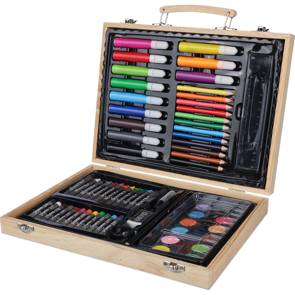 Art drawing set in a wooden pine case. Contains 12 wax crayons, 12 sharpened coloured pencils, 12 felt-tip pens, 12 oil crayons, a glue stick, eraser, pencil sharpener, ruler, brush, 12 paints and a palette. Packed individually in a brown carton box, leaving the handle accessible for carrying.